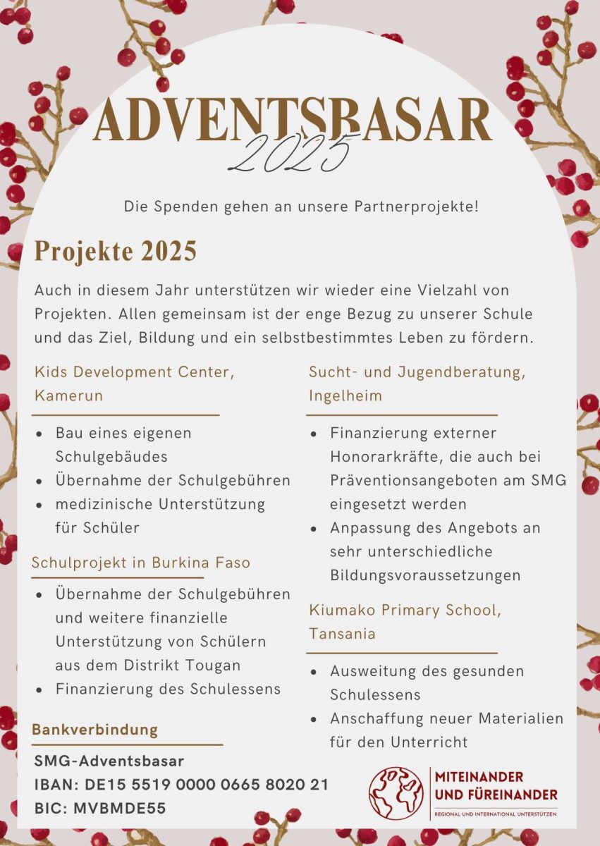 Der jährlich am letzten Freitag im November stattfindende Adventsbasar hat eine lange Tradition am SMG. Die Schulgemeinschaft begreift dieses zum festen Bestandteil eines jeden Schuljahres gewordene Ereignis als Möglichkeit, in der Vorweihnachtszeit bewusst den Blick dorthin zu richten, wo Menschen unserer Unterstützung bedürfen, und gemeinsam etwas Gutes zu bewirken.