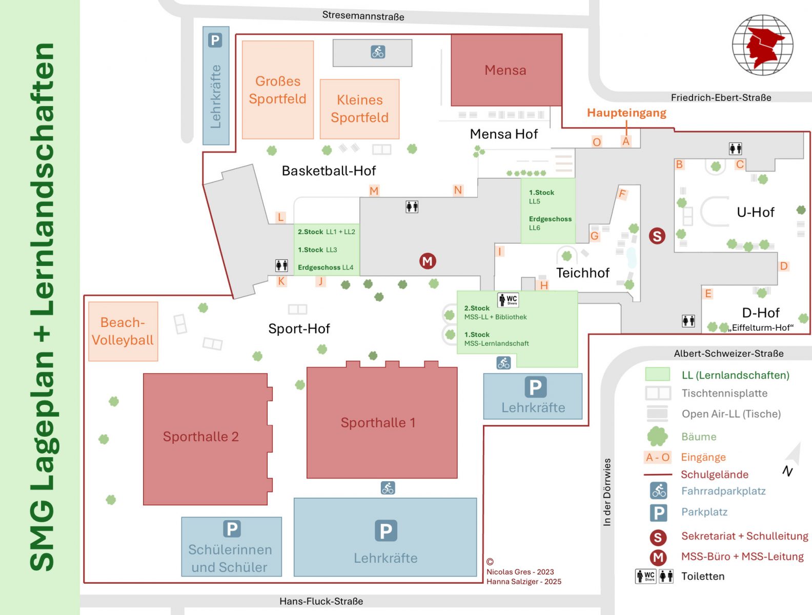 Nachfolgend finden Sie den Lageplan unserer Schule und darunterstehend die Lage der Schule in Ingelheim (OpenStreetMap). Gäste benutzen bitte ausschließlich den Haupteingang A.